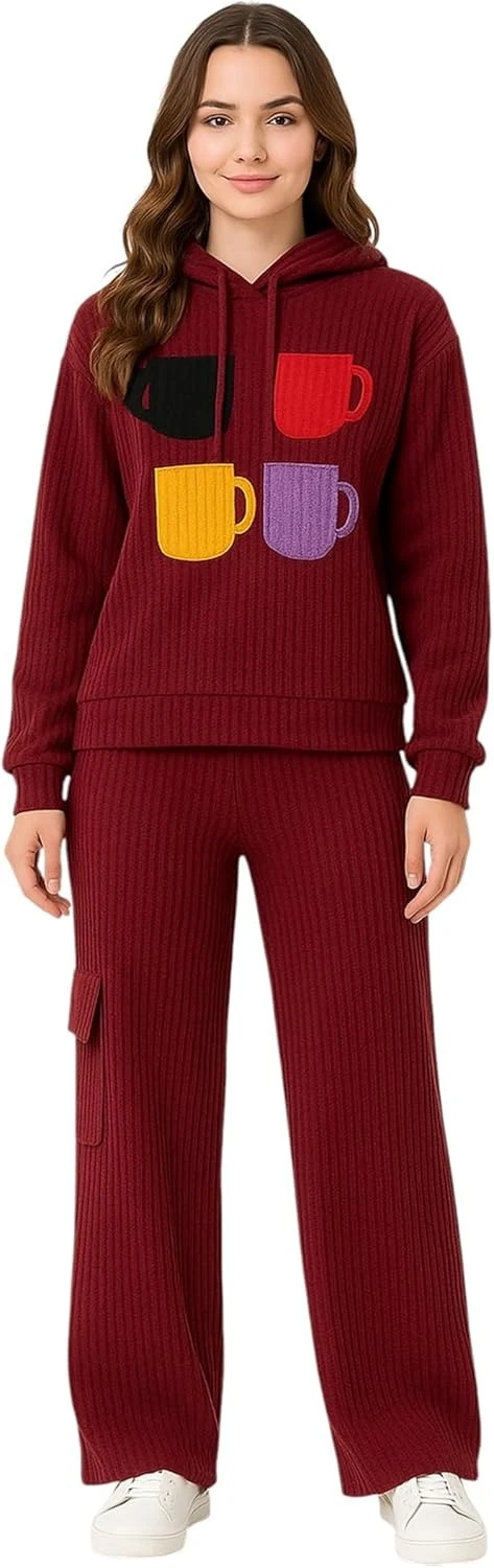 طقم بنات Miza Comfy – هودي وبنطلون كارغو محبوك مع تطريز أكواب ملونة – طقم شتوي من قطعتين