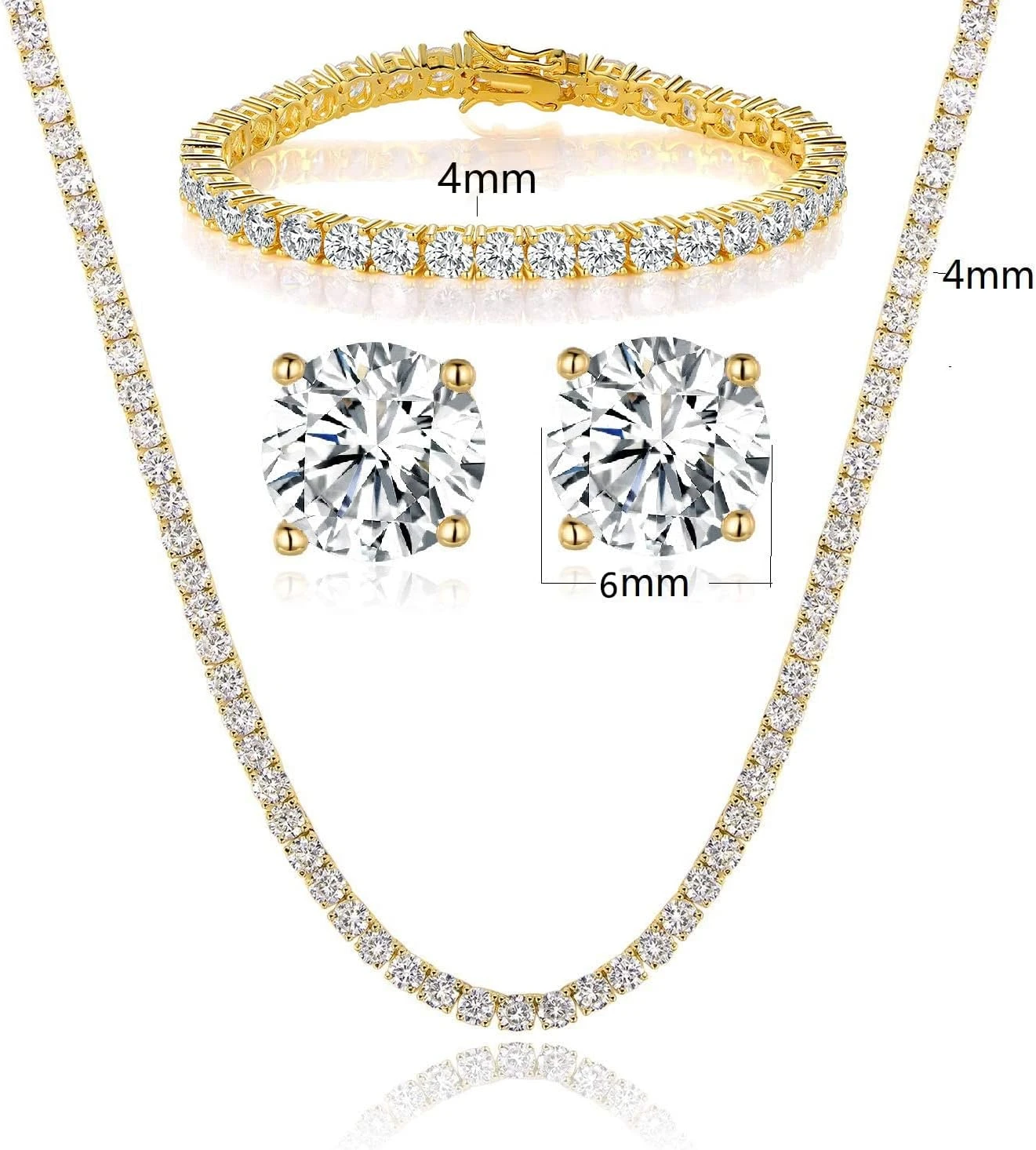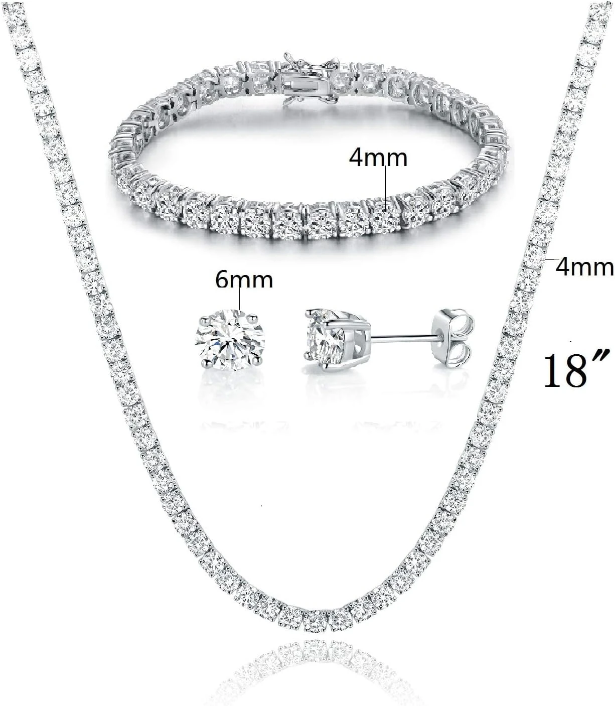 تتضمن هذه المجموعة قلادة تينيس بطول 18 بوصة، سوار تينيس بطول 7.5 بوصة، وأقراط سداسية 6 مم. مصنوعة من الزركونيا المكعبة عالية الجودة، مع تشطيب لامع، وطلاء بالذهب الأبيض عيار 18 قيراط، وتشطيب فاخر.