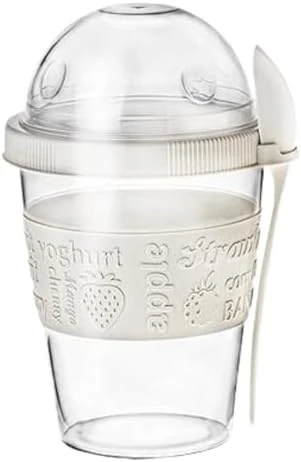 طقم أكواب زبادي – 600مل مع غطاء وملعقة، خالية من BPA، قابلة لإعادة الاستخدام (رمادي فاتح)