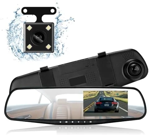 كاميرا مرآة سيارة AUTOUTLET بشاشة 4.3 بوصة HD بدقة 1080P بعدستين أمامية وخلفية مع نظام تسجيل مدمج